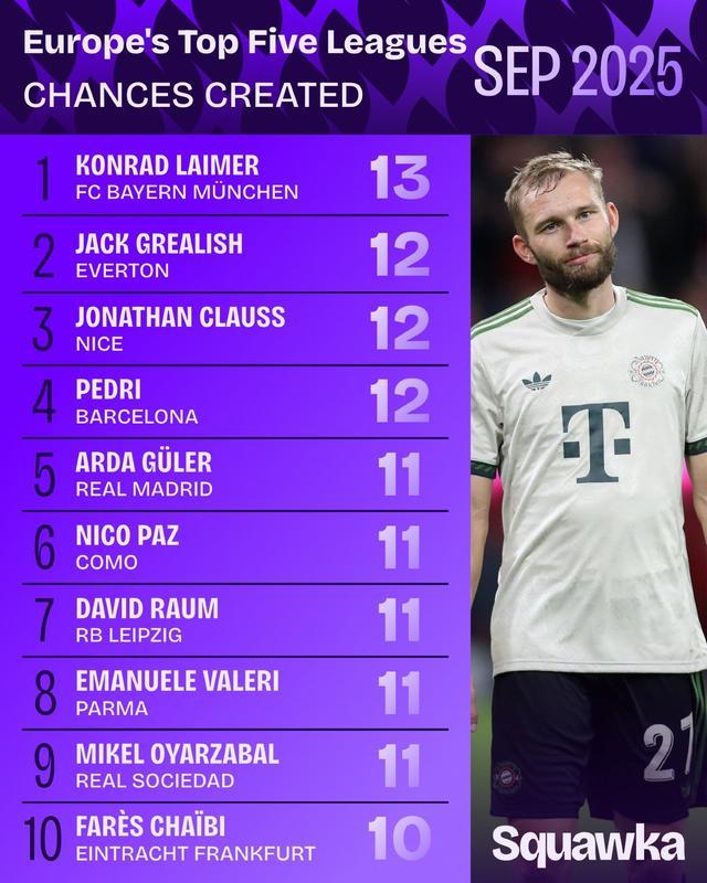 10月1日,数据机构Squawka公布九月份统计数据,拜仁边后卫莱默尔在9月创造13次机会,位居五大联赛球员之首。